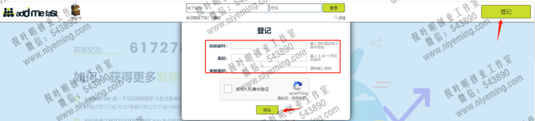 首先点击右上角的登记,在这里输入自己的邮箱并设置一个密码。