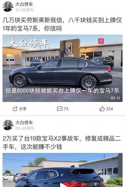 所有的视频无一例外都是10万、20万搞了一个现在价格在几百万的泡水车、火烧车然后修复之后XXX之类的东西。